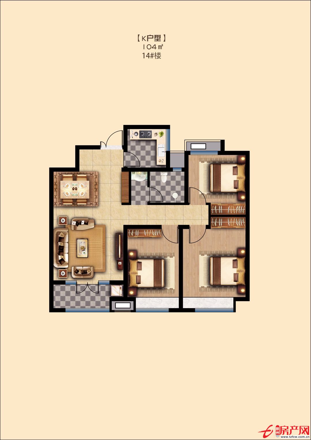 K戶型 3室2廳1衛 建面:104m2