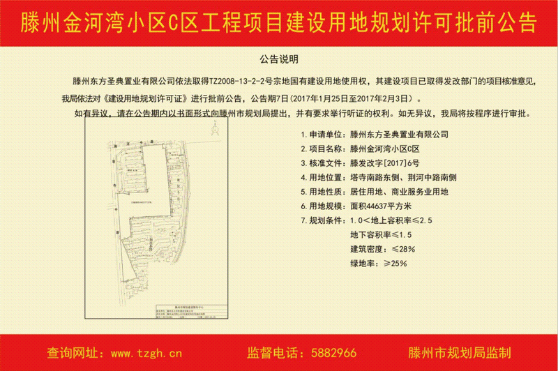 滕州房產網 2017-03-01滕州東方圣典置業有限公司依法取得TZ2008-13-2-2號宗地國有建設使用權,其建設項目已取得發改部門的項目核準意見,我局依法對《建設用地規劃許可證》進行批前公告,公告期七日(2017年1月25日至2017年2月3日)。如有異議,請在公告...