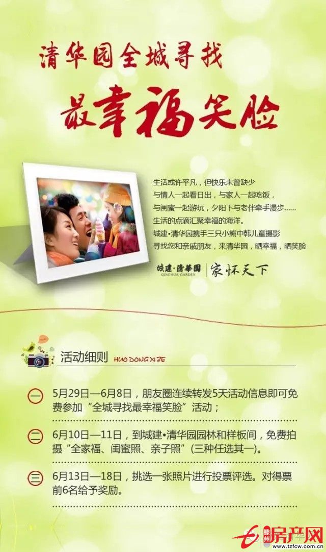 滕州房產網 2016-06-03“城建·清華園全城尋找最幸福笑臉—免費主題拍攝”活動微信已發送第4天,今天的微信你轉發了么?再堅持明天一天,就可以領取拍攝兌換券啦!今天的微信主題是參與本次活動不可抗拒的4個理由:1、感受親情、愛情、友情,留下幸福瞬間6月10日、11日是端...