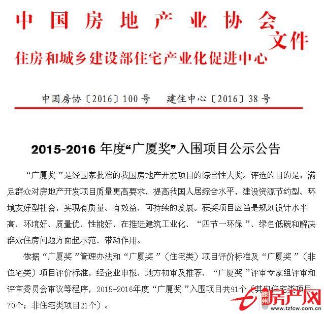 市房地產服務中心 2016-11-18近日,中國房地產業協會、住房和城鄉建設部住宅產業化促進中心聯合發布了2015—2016年度“廣廈獎”入圍項目的公示公告,山東省共15個項目入圍。由滕州市中房房地產開發有限公司開發的中房·緹香郡小區項目入圍,成為我市唯一入圍項目。據了解,“廣...