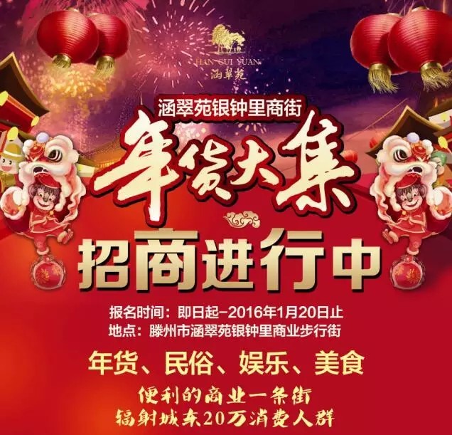 春節是中國一年中最大、最喜慶的傳統節日,是中國人最重要的節日。涵翠苑本著倡導綠色生活,引導健康消費,弘揚傳統文化,服務市民生活,特此將舉辦2016年貨大集。報名時間:即日起—2016年1月20日活動時間:2016年1月30日—2016年2月...