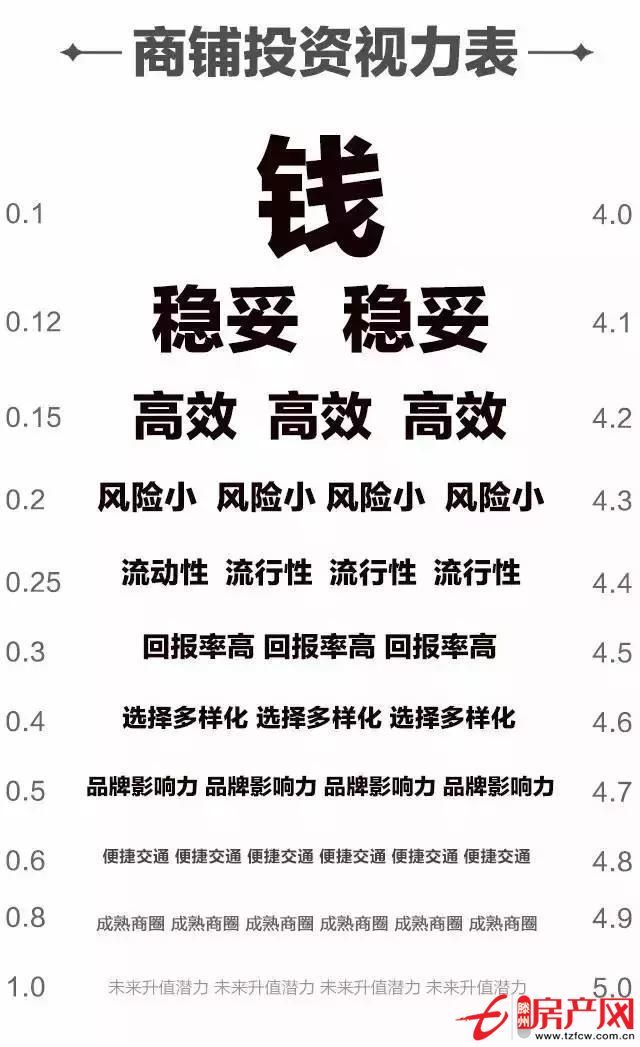 滕州房產網 2017-10-19商鋪需要好的眼光,商鋪投資應該注重哪些問題,怎樣才算的上真正的鎏金好鋪,先來看看這張商鋪投資視力表。你的視力達到了幾級?如果你只看到第一行,那你就太“近視”啦!無論是買鋪高手,還是新晉小白,要想買到好鋪,必須看得遠,看得細。從這張視力表中就...