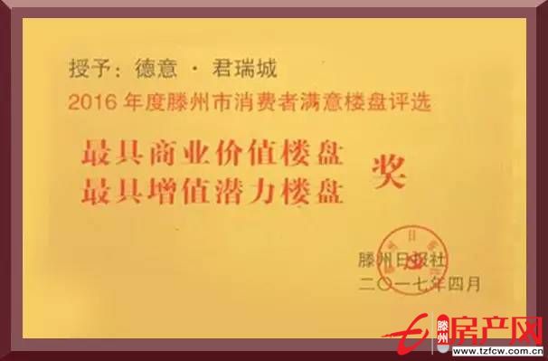 滕州房產網 2017-04-17今日,由滕州日報舉辦的滕州市消費者滿意樓盤評選活動暨頒獎典禮盛大舉行,君瑞城榮摘2016年度最具商業價值樓盤與最具增值潛力樓盤大獎。此次獲獎,離不開市政府的幫助與我市人民的長期熱情支持,正是因為有這樣一方堅實后盾,君瑞城才取得這般令人深感驕...