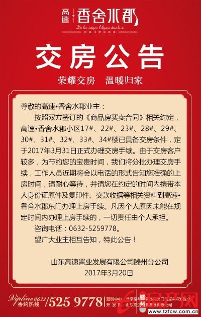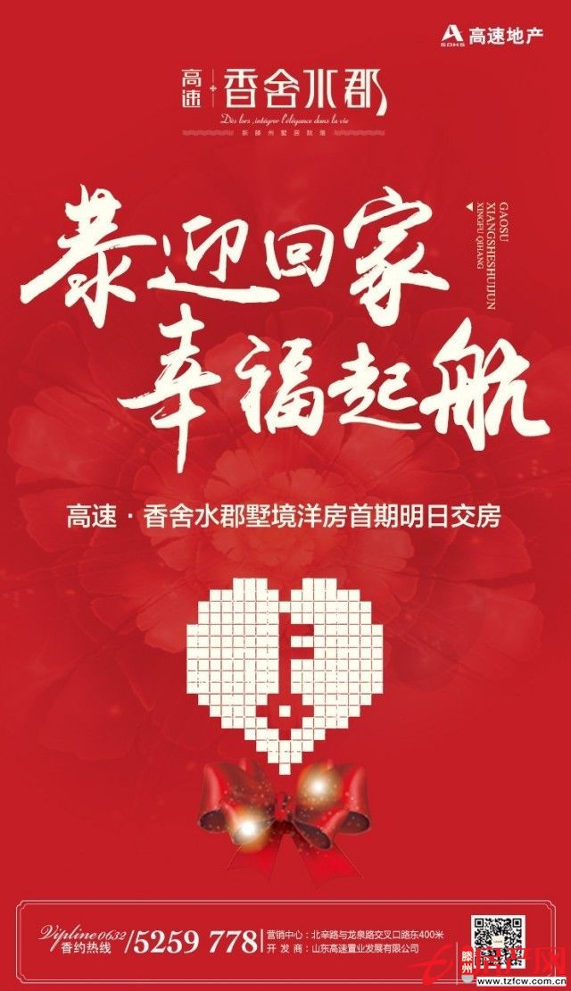 滕州房產網 2017-04-08家,是心靈的港灣,是幸福的源泉,而房子則是家的載體,在廣大業主的翹首企盼中,高速·香舍水郡墅境洋房首期交房完美收官,項目以高端的建筑品質、貼心的物業管家、醇熟的生態社區環境呈現,為業主交上一份滿意的答卷。為了恭迎每一位業主回家,高速地產工作...