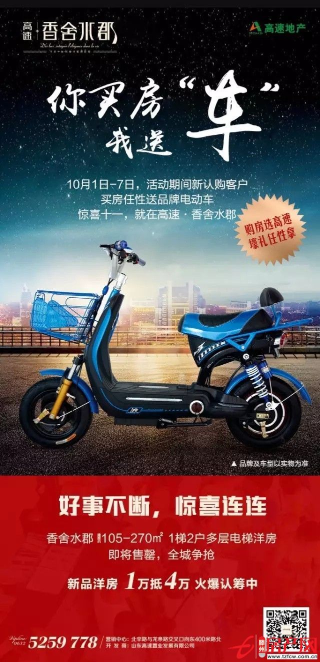 滕州房產網 2016-10-07國慶期間凡成功購買高速·香舍水郡住宅即可獲贈品牌電瓶車一輛讓我們大聲宣布:這個電動車是我的了~實力“炫富”,絕對碾壓朋友圈...