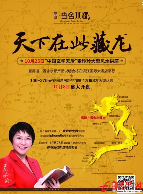 滕州房產網 2015-10-2610月25日,“香港玄學第一人”——麥玲玲將親臨滕州,在濱江國際大酒店舉辦大型風水講座。解密風水大勢,現場答疑解惑,千金難覓與大師面對面的良機,全滕州翹首以盼!五千年中華文明,文脈傳承風水相襲,堪輿幾乎涉及所有領域。從城市建址,如四大名都北...