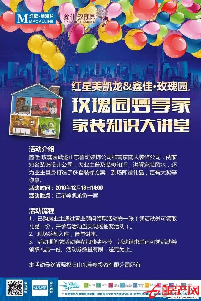滕州房產網 2016-12-19鑫佳·玫瑰園誠邀山東魯班裝飾有限公司和南京南大裝飾公司,兩家知名裝飾公司,為業主普及裝修知識,講解家裝風水,還未業主量身大招了多套裝修方案,到場即送禮品,更有大獎等你拿?;顒訒r間:2016年12月18日14:00活動地點:紅星美凱龍負一層活...