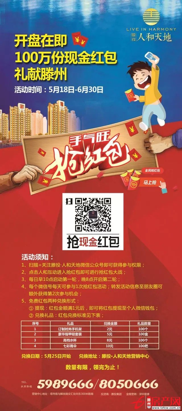滕州房產網 2016-06-111、報名時間:第一輪活動報名時間為6月8日-10日第二輪活動報名時間為6月13日-17日2、抽獎日期:2016年6月12日、6月19日3、抽獎時間:上午9:30現場簽到;10:00準時抽獎,逾期不到,視為棄權;4、活動地點:滕投·人和天地營...