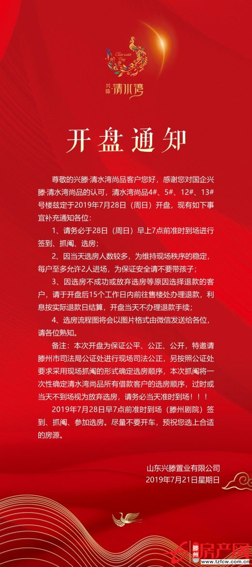 滕州房產網 2019-07-31尊敬的(興滕清水灣尚品)意向購房客戶您好!接有關部門通知,由于28日善國路劇院路段停電,現開盤時間推遲一天,時間更改為2019年7月29日(周一)早7:00,地點仍定為滕州劇院,請務必周知,為此造成的不便還望海涵。感謝您對國企興滕·清水灣尚...
