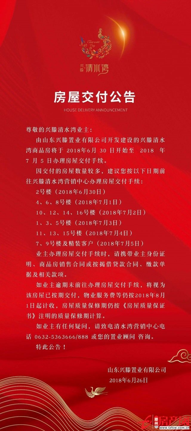 滕州房產網 2018-07-02接本公司領導通知,上房工作暫緩,具體上房交付時間另行通知!山東興滕置業有限公司2018年6月28日...