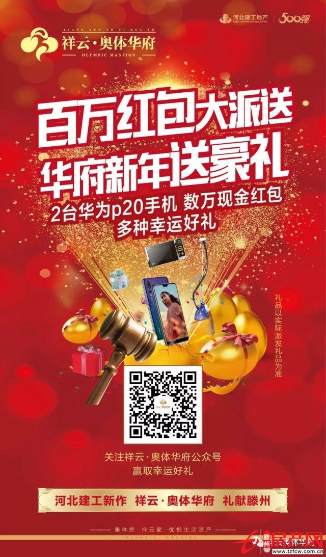 滕州房產網 2019-01-02河北建工又一力作,祥云·奧體華府濃情賀歲,攜著美好的新年祝福。建面約98-207平方臻美戶型,60萬平米法式闊邸大宅,獻禮滕州!凡2019年1月1日關注祥云奧體華府公眾號,參加微信活動,有機會獲得現金紅包!驚喜禮品!更有機會參加華為p20手...