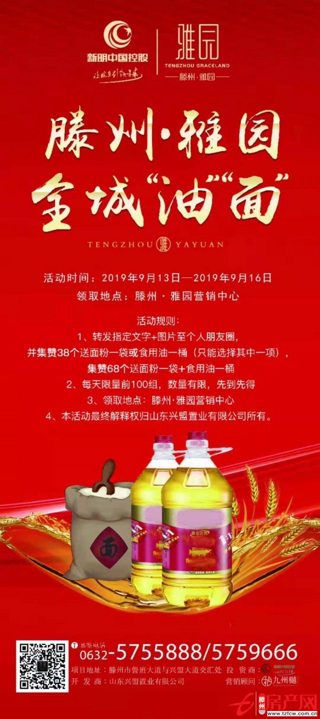 滕州房產網 2019-09-04滕州雅園,“鯉”獻滕州,活動時間:2019年9月4日—2019年9月8日,活動開始前可至售樓處領取活動禮品券。活動規則:參與人憑禮品券領取鯉魚壹條,每天限量100條,數量有限,先到先得,送完為止;領取時間為活動期內上午9:30—11:30,...