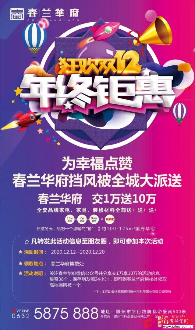 雙十二快來了,春蘭華府又要搞事情?神馬?往下看!小編要告訴大家一個好消息?。。〈禾m華府愛心送暖,助力暖冬,免費送冬季加厚高檔擋風被啦!集贊免費送擋風被活動時間、領取時間及地點:2020年12月12日--12月20日,領取地點在春蘭華府售樓處...