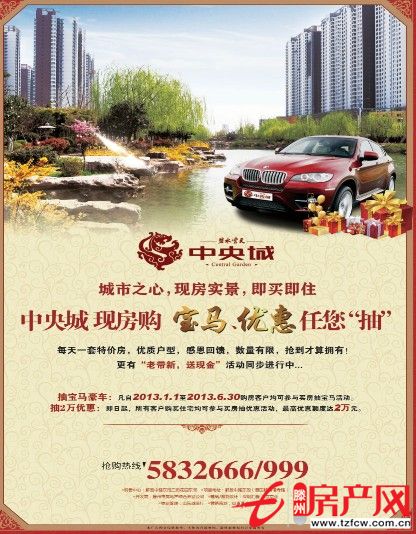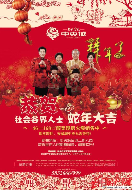 2013-04-01新春來臨,中央城全體工作人員恭祝全市人民新春愉快,闔家歡樂!看房有禮,新年紅包天天送活動盛大開幕!即日起中央城到店看房即送賀年禮,另有萬元紅包等你拿!購房熱線:0632-5832666/999...