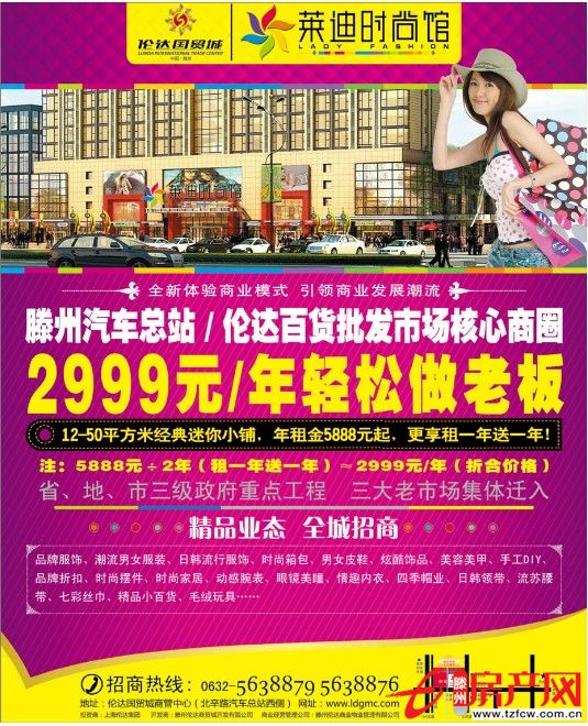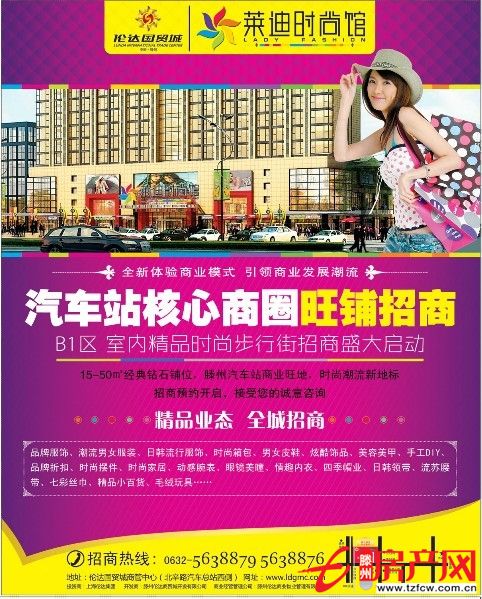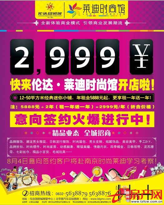 2012-08-17萊迪時尚館,全城沸騰搶鋪!12-50平方米經典迷你小鋪,年租金5888元起,更享租一年送一年!招商熱線:0632-56388795638876地址:倫達國貿城商管中心(北辛路汽車總站西側)網址:/uploads/news/www.ldgmc...