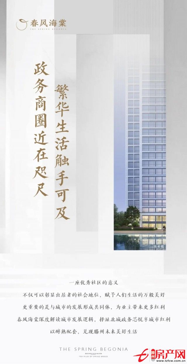 市行政審批服務局 2021-04-20*溫馨提示:1、本項目開發商:滕州嘉益房地產有限公司;推廣名:春風海棠,核準地名以地名辦審批為準;2、本宣傳資料為要約邀請,不作為要約或承諾;買賣雙方的權利義務以雙方簽訂的《商品房買賣合同》及其補充協議、附件等書面文件為準;3、本宣傳資料內...