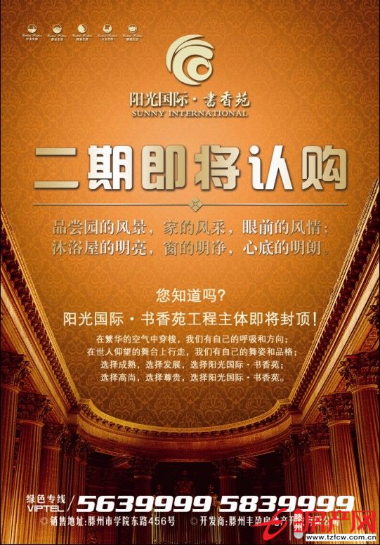 2012-11-09七所學校輔茁超大配套陽光國際文化廣場投資2000萬打造的小區園林景觀5A級物業管理國際知名連鎖超市準現房呈現上午買下午住銷售地址:滕州市學院路456號綠色專線:0632-5639999/5839999...