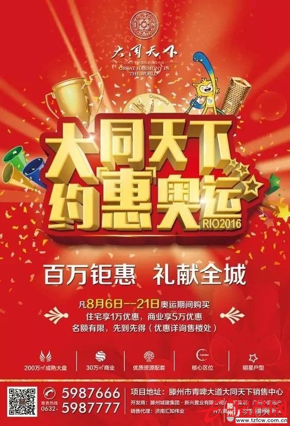 百萬鉅惠,禮獻全城。凡8月6日--21日奧運會期間購買住宅享1萬優惠,商業享5萬優惠。名額有限,先到先得!...