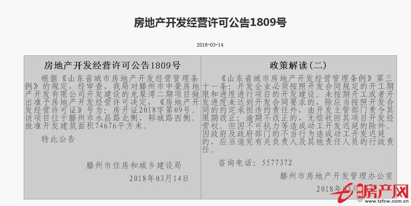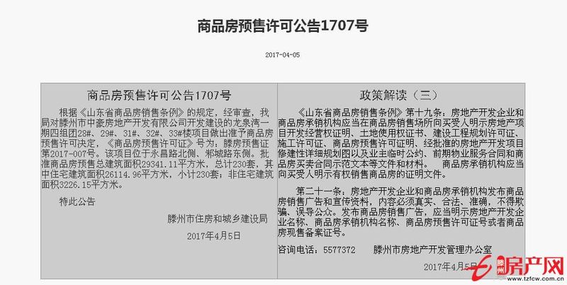 商品房預售許可公告1717號根據《山東省商品房銷售條例》的規定,經審查,我局對滕州市中豪房地產開發有限公司開發建設的龍泉灣一期四組團(34#、36#樓)項目做出準予商品房預售許可決定,《商品房預售許可證》號為:滕房預售證第2017-017號...