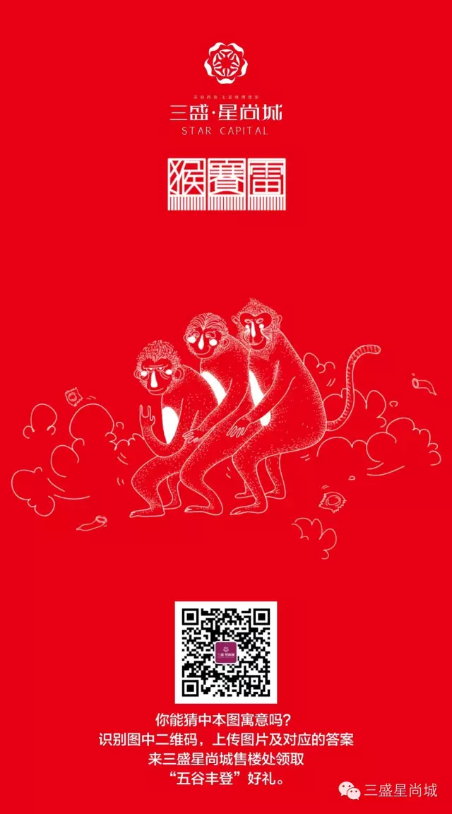 滕州房產網 2016-02-02“猴賽雷”來啦!2016猴年的到來,希望在新的一年里大家一起猴賽雷!你能猜中下面圖的寓意嗎?識別圖中二維碼,上傳圖片及相應答案來三盛·星尚城售樓處領取“五谷豐登”好禮!...