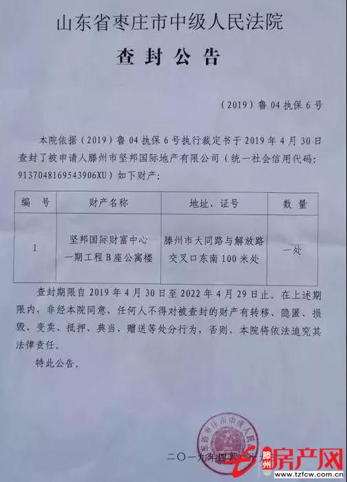 滕州房產網 2019-06-17近日,山東省棗莊市中級人民法院查封位于滕州市大同路與解放路交叉口東南100米處的堅邦國際財富中心一期工程B座公寓樓,查封期限自2019年4月30日至2022年4月29日止。此前,山東兗礦輕合金有限公司曾向社會發布致廣大購房戶的一封公開信,由...
