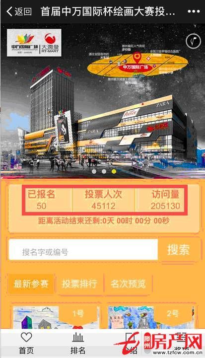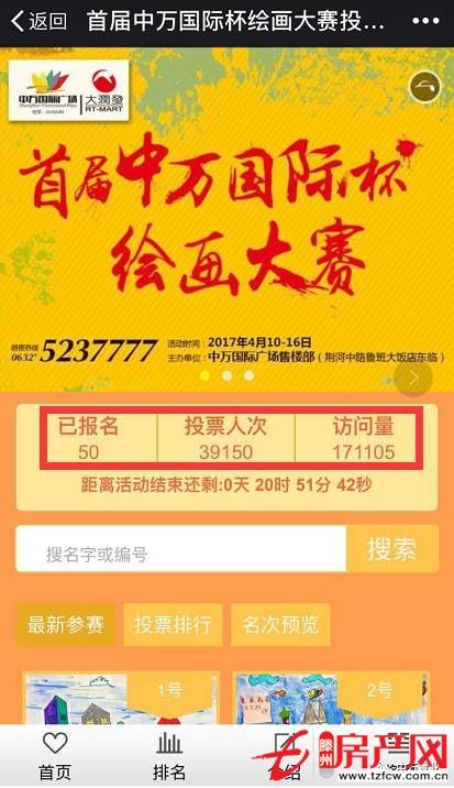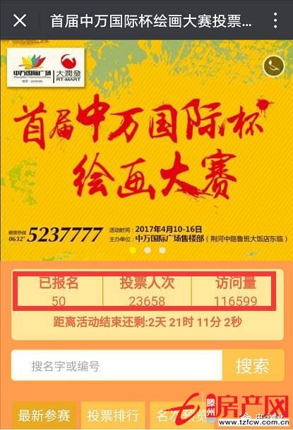滕州房產網 2017-04-15首屆中萬國際杯繪畫大賽圓滿落幕,線上投票短短三天,2萬多人為選手投票,11萬多人關注本次比賽,選手票數非常接近,局勢是否還會逆轉?還有反超?落后的小畫家不要氣餒!距投票結束還有2天,加大馬力,大獎就會屬于你!各位粉絲也要抓緊行動,速速為自己...