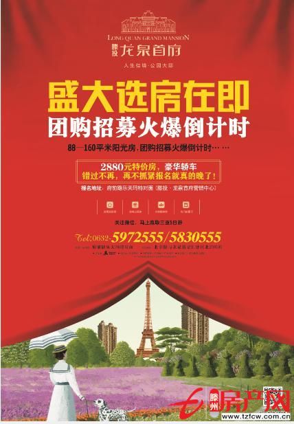 滕州房產網 2014-04-19滕投·龍泉首府4月19日于濱江國際大酒店盛大選房!錯過4月19日,也許你失去的不只是龍泉首府團購計劃,而是一種尊貴的生活享受……“人生佳境·公園大邸”奢侈規劃,打造圈層榮耀。10%造城,90%造景,60000平米中心花園,5000平米頂級會...