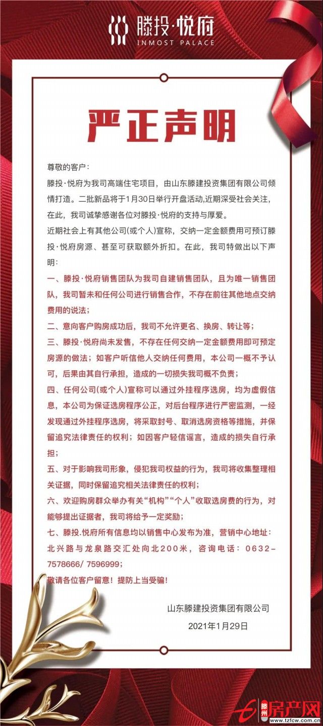 滕州房產網 2021-05-12尊敬的滕州市民:滕投·悅府營銷中心于2019年底正式公開,開放至今,現場來訪客戶眾多,滕投·悅府的住宅產品因自身諸多優勢,公開以來廣受全市人民的熱捧,我司在此非常感謝廣大市民對項目的支持與認可。近期,滕投·悅府二批新品開盤日期臨近,部分有意...