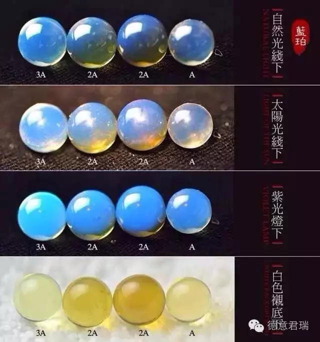 隨著光線變幻,藍珀會產生特殊光學效應,呈現出藍綠黃紫褐等五種以上顏色,按其顏色可分為淺藍、深藍、天空藍、紫羅蘭、海水藍、深墨藍、紅藍、黃藍、綠藍等多個品種,以目前的產量及美觀美觀度劃分,最為頂級的可算是特色天空藍、天空藍,次頂的是深藍,之后排到紫羅蘭、藍,最為常見的是藍綠。