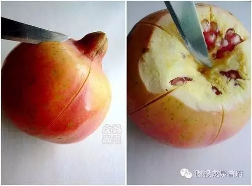 3.用刀順著石榴的白筋在外皮劃幾刀。刀口不要太深,劃開石榴皮就行了。