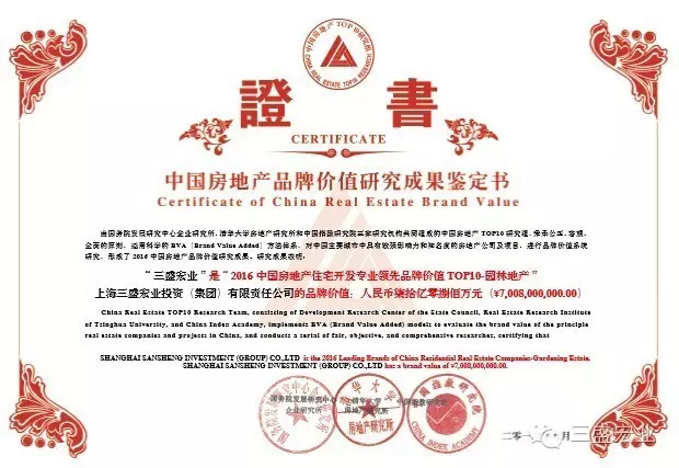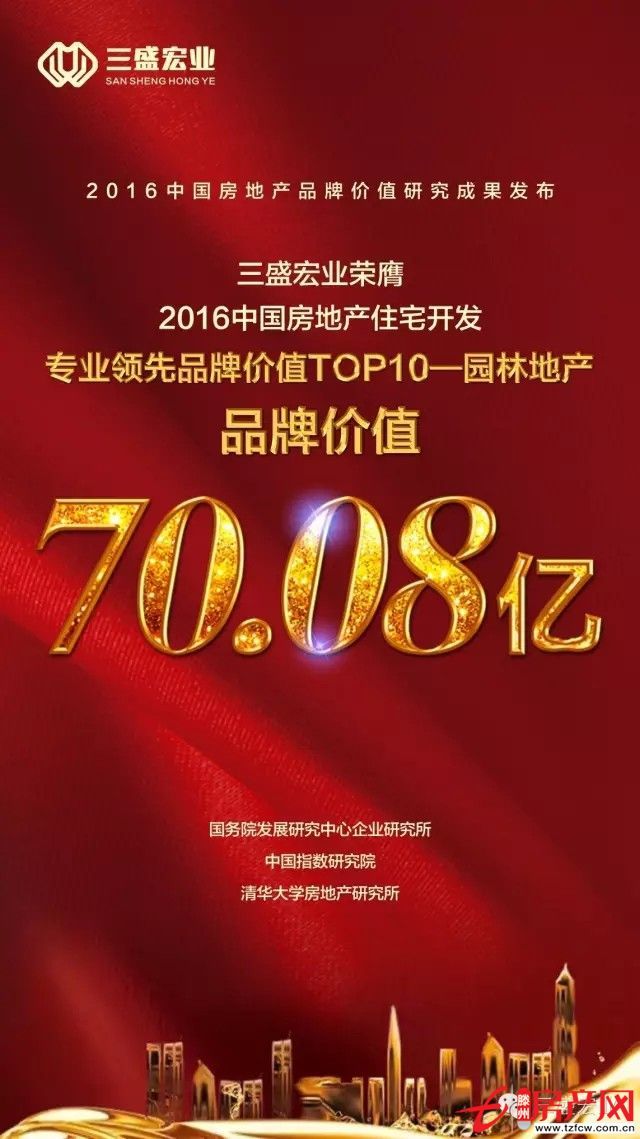 三盛宏業榮膺“2016中國房地產住宅開發專業領先品牌價值TOP10——園林地產”殊榮,品牌價值達70.08億!