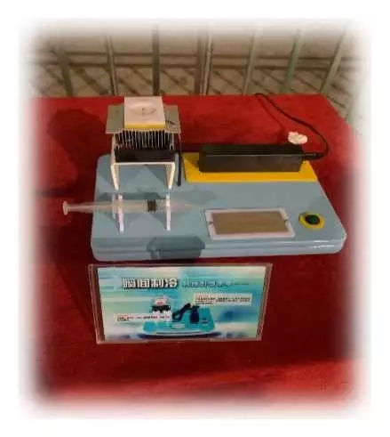 由面板、制冷片、風機、散熱器等組成,面板由亞克力板制成。當接觸額定電源時,兩面溫度差在一分鐘的時間內可以達到30攝氏度以上,在散射器上滴幾滴水可以看到很快就會結冰。