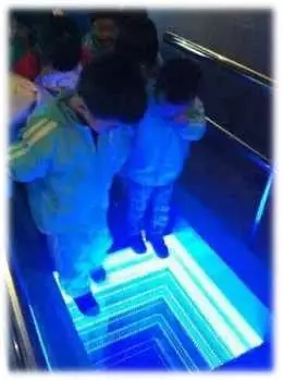 走上展臺,透過玻璃向下看,感覺腳下是可怕的萬丈深淵,不禁倒吸一口涼氣!平地上也如親臨險境。你有勇氣踏上萬丈深淵?當人站在上面可體會到“如臨深淵”的感覺,這是光的多次反射產生的,有恐高癥者請勿走上。