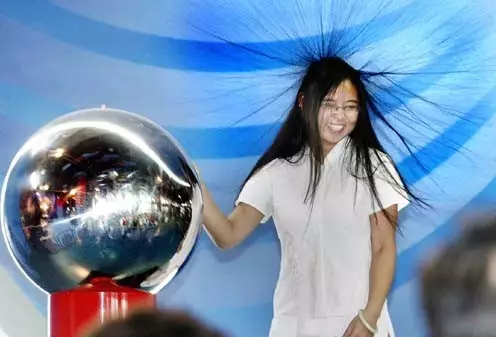 當游戲參與者把手放到球上后,身體導入靜電,進而頭發導電后就產生了同性電,由于同性相斥,于是每一根頭發自然都相互排斥以達到距離最遠,形成怒發沖冠的效果。這不就是非主流嘛?炫酷靜電,發型要亂!