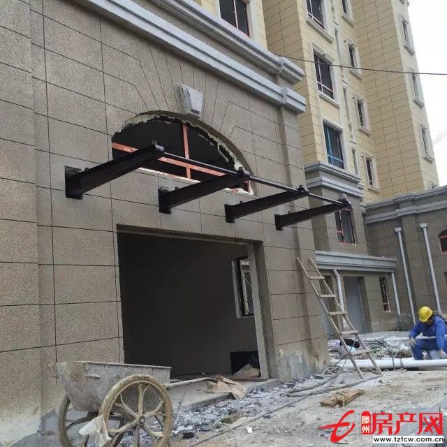 入戶大堂臺階,部分已經鋪設完成,可以清楚的看到大堂完成后與樓體交相輝映的大氣磅礴。入戶大堂遮陽雨棚鋼結構骨架也已經架設,只等待最后一步的覆蓋,入戶關愛,步步用心。