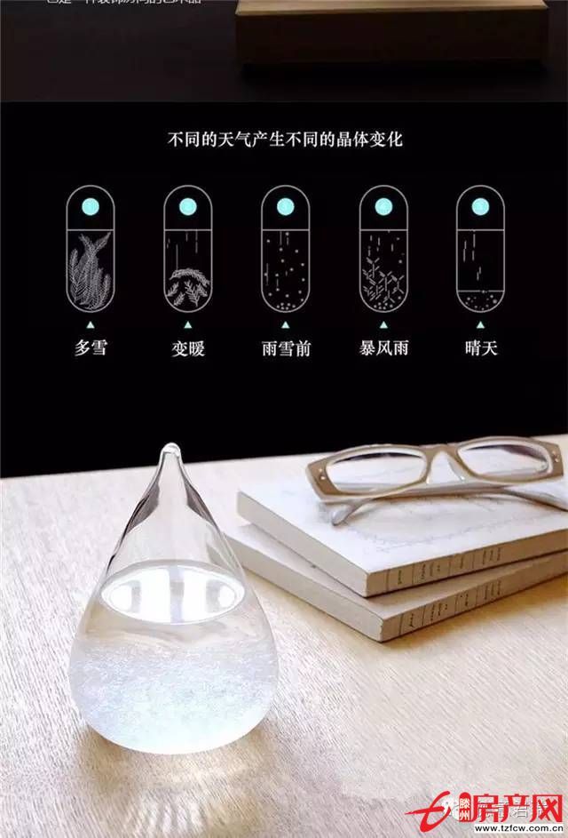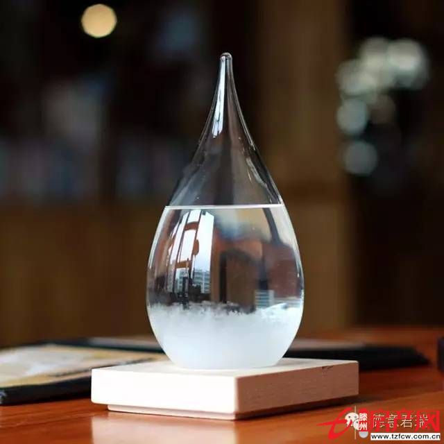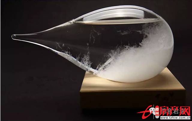風暴瓶起源于19世紀歐洲的天氣預測器Storm Galss,在密封玻璃瓶內按照一定比例注入蒸餾水、酒精、硝酸鉀、氯化銨和樟腦等化學品組成混合溶液,然后就可以通過瓶內液體結晶狀況來預測天氣。當溫度變化時,里面的晶體會展現出絢麗多彩的變化。如果瓶中液體清澈干凈,這就意味這接下來的天氣將是晴朗萬里無云;如果瓶中液體呈現出混濁朦朧的狀態,就意味著天氣將轉變成陰霾多云;而當透明玻璃瓶中出現白色如羽毛狀的結晶物時,就說明馬上要降溫甚至下雪啦。