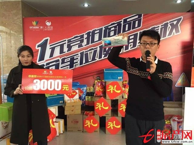 現場豐富禮品展示柴米油鹽、高檔茶具、收納箱、車位使用權等,客戶仔細聆聽拍賣物品價格,大哥花15元拍得5kg米,3元錢拍走了(鹽、醬油、醋、洗衣粉)......