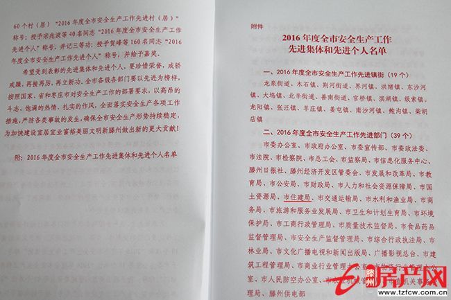 2月7日,全市安全生產工作會議召開,會議表彰了2016年度全市安全生產工作先進鎮街、先進部門、先進單位、先進村居和先進個人。市住建局榮獲“2016年度全市安全生產工作先進部門”;房地產管理局、滕州華潤燃氣有限責任公司等2個單位獲“2016年度全市安全生產工作先進單位”;1人榮獲安全生產工作三等功,3人榮獲安全生產工作嘉獎;同時全面完成了全年安全生產控制指標。