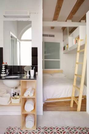 西班牙一個65㎡的公寓,小小空間有多個功能間,風格簡約。最贊的是床上的小空間,是個能安心將自己藏在里面放松自己的秘密基地。