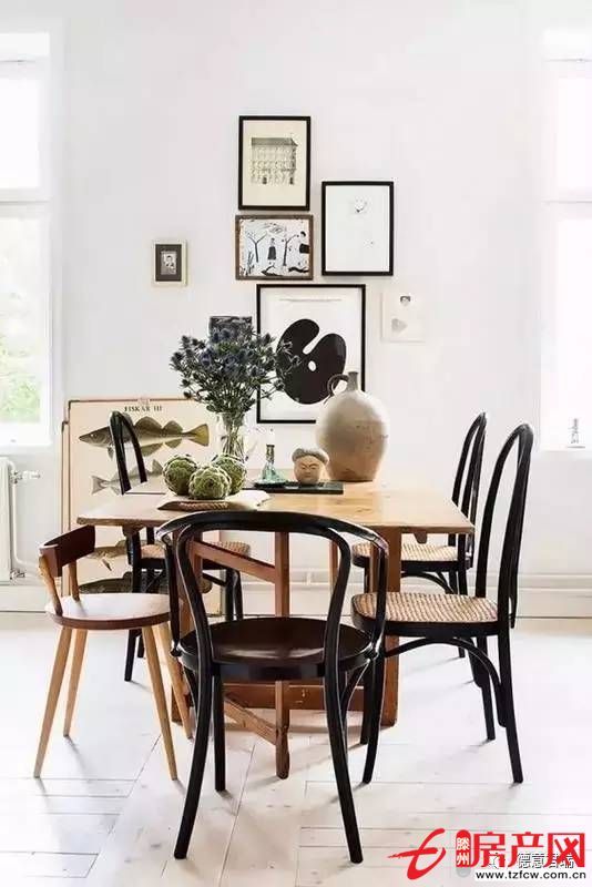 不同氣質的餐椅聚集在一起帶來風格混搭的概念,無論是復古的溫莎椅+現代的伊姆斯椅,還是華麗的宮廷椅+樸素的簡約靠背椅,都讓同一空間同時擁有了不同的氣質。