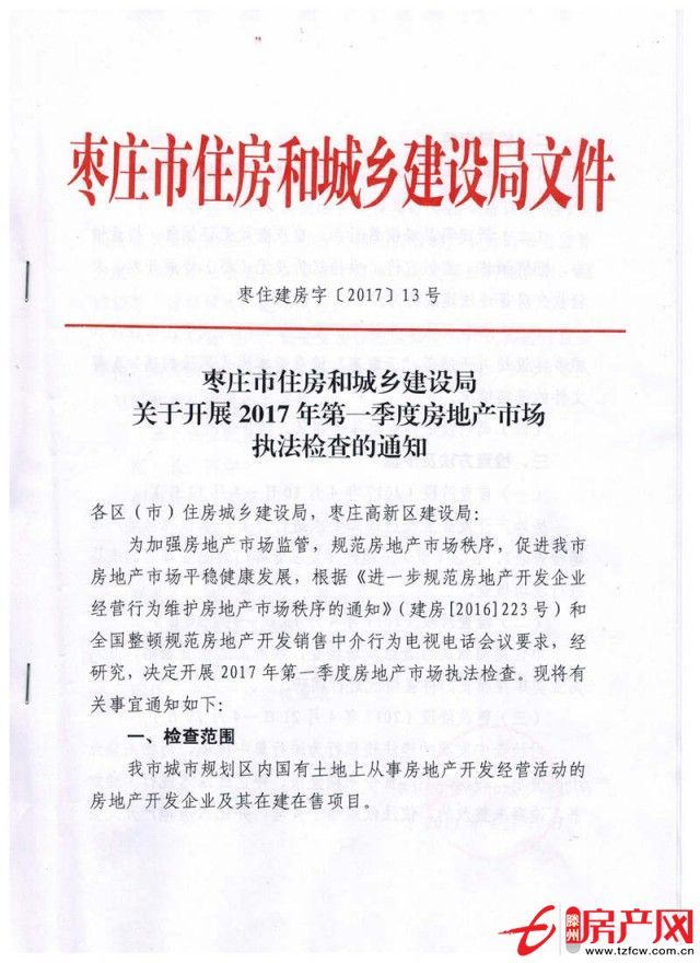 根據棗莊市住房和城鄉建設局《關于開展2017年第一季度房地產市場執法檢查的通知》精神,現將有關事項明確如下: