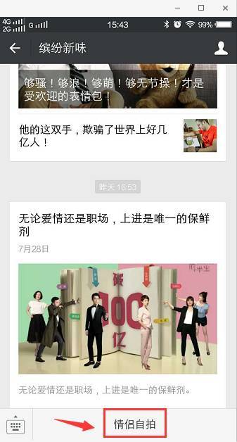 2、進入繽紛新味公眾號,找到底部導航欄“情侶自拍”點擊。