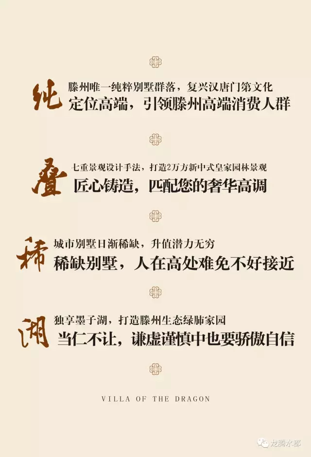 龍騰水郡別墅——坐落于滕州東部新城核心區,稀缺的新中式漢唐別墅區,不遠處是車水馬龍的都市繁華,眼前是開闊自由又不失尊崇的家。于此,難以復制的不只有頂級的名流圈層,更有著尋常住區難以企及的浪漫生活方式!