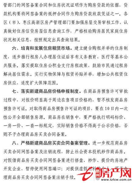 五、全面實行購房資格審核制度。購房人應提供房屋交易主管部門的網簽備案合同和住房狀況證明作為購房貸款的依據,貸款機構要將網簽備案的抵押合同作為購房貸款放款憑證之一。各區(市)、棗莊高新區房產管理部門要加強房屋交易審核工作,認真做好住房信貸房屋信息查詢工作,嚴格核驗購房居民家庭住房狀況相關信息,按照規定出具查詢結果。