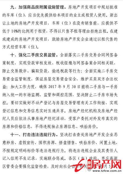 十、強化二手房交易監管。全面落實二手房交易合同網簽備案制度,實現貸款審核發放、稅收征繳與網簽備案合同相關聯,防止交易欺詐、騙取貸款、偷逃稅款等行為;全面實施二手房交易資金監管制度,保證房屋交易資金安全,維護買賣雙方合法權益;加大工作力度,確保2017年9月30日前將二手房與一手房納入統一的市場監測、監管和調控范圍,堅決防止二手房市場失控。要切實做好不動產登記與房屋交易管理有關工作銜接,實現登記信息和交易信息實時互通共享。房地產經紀機構及房地產經紀人員應依法從事房地產經紀活動,受客戶委托對外發布真實的房源和價格信息,不得違規獨占房源信息、哄抬房價。
