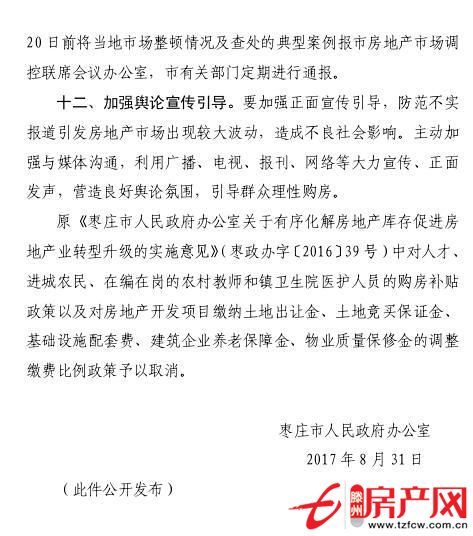 同時,原《棗莊市人民政府辦公室關于有序化解房地產庫存促進房地產業轉型升級的實施意見》(棗政辦字〔2016〕39號)中對人才、進城農民、在編在崗的農村教師和鎮衛生院醫護人員的購房補貼政策以及對房地產開發項目繳納土地出讓金、土地競買保證金、基礎設施配套費、建筑企業養老保障金、物業質量保修金的調整繳費比例政策予以取消。