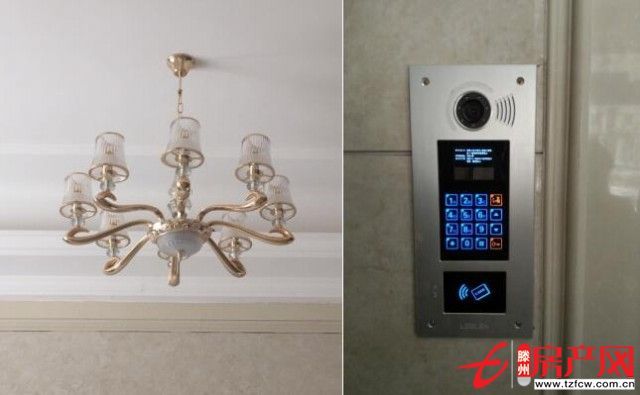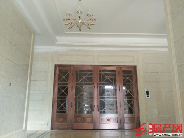 進入樓棟內部,入戶大堂已基本達到交房標準。我們可以看到,入戶大堂配備豪華吊燈與簡歐風格的入戶大門,并配有樓宇智能對講系統。集奢華與智能于一身,賞心悅目的同時又方便了業主入住后的居家生活。