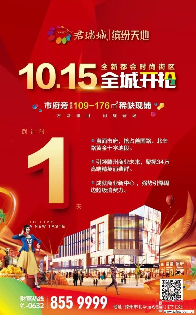 現在,距離君瑞城繽紛天地臻稀好鋪開搶僅剩1天,距離三代旺鋪開搶僅剩1天,距離未來滕城繁華之地開搶僅剩1天,距離滕州高品消費人氣大鋪開搶僅剩1天。老板,請準備好開搶姿勢!