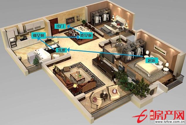 從下圖中可以看出,戶型動線會直接影響到住戶的生活,如果動線不合理,就需要住戶按原路返回,或是各個功能區間交叉行走,不僅浪費時間,而且還會影響其他家庭成員的活動。