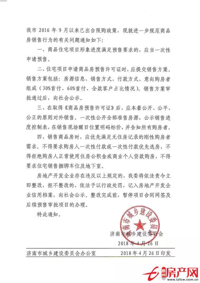 26日,濟南市建委發布《關于進一步規范商品房銷售行為的通知》,對商品房銷售行為進一步規范。《通知》首次明確表明,銷售商品房時,應優先滿足無住房記錄的剛性購房者需求。不得要求購房人一次性付款或一次性付款優先選房。